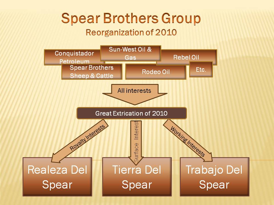Realeza was created in 2010 as part of an effort to pare down our plethora of companies from thirteen to three: Trabajo, Realeza and Tierra Del Spear. In Spanish, realeza means “royal”; hence, interests for which we receive compensation when others drill on us (i.e., royalty interests) belong here. In 2010 and 2011 thousands of royalty interest properties were meticulously moved from thirteen SBG companies and now reside in Realeza. At the same time, properties in which we held a working interest were moved to Trabajo and properties for which we owned the surface rights to were moved to Tierra.